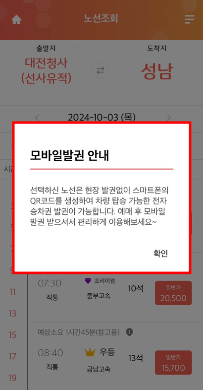 5. 모바일 발권 시 터미널에서 표를 발권하지 않아도 QR코드를 이용하여 버스 탑승이 가능합니다.