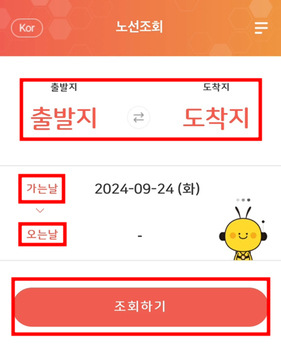 4. 가는 날짜 선택 → 오는 날짜 선택 (왕복 예매 시) → 조회 를 누른 후 원하는 시간대를 선택합니다.