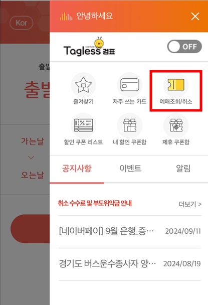 모바일 발권은 '버스타고 어플-상단 메뉴바-예매조회/취소' 에서 할 수 있습니다.