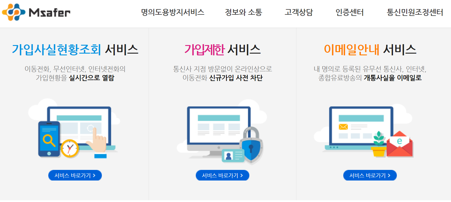 엠세이퍼 홈페이지 에서는 가입사실현황조회서비스, 가입제한서비스, 이메일안내서비스 등을 이용할 수 있습니다.