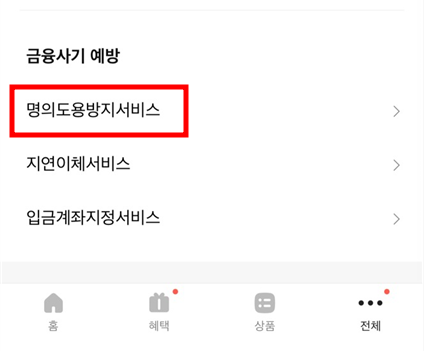 2. 맨 아래에 '명의도용방지서비스'를 선택합니다.