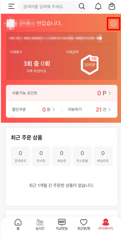 2. 하단에 있는 '마이페이지' 를 선택 후 톱니바퀴를 누른 후 위메프 비밀번호를 입력합니다.