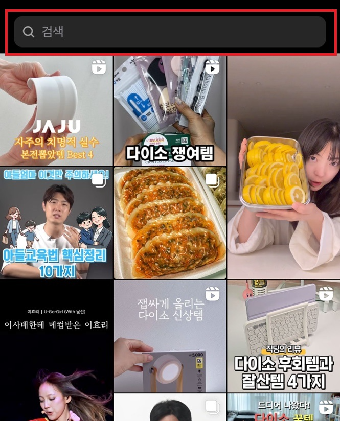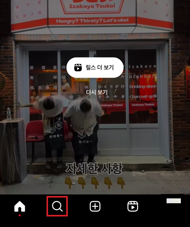인스타그램 앱을 열어 하단의 돋보기 아이콘을 누릅니다.