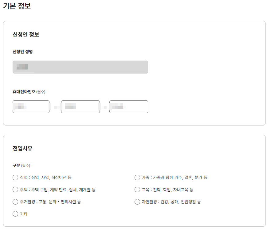 3. 기본정보 입력 후 전입신고 사유를 선택합니다.
