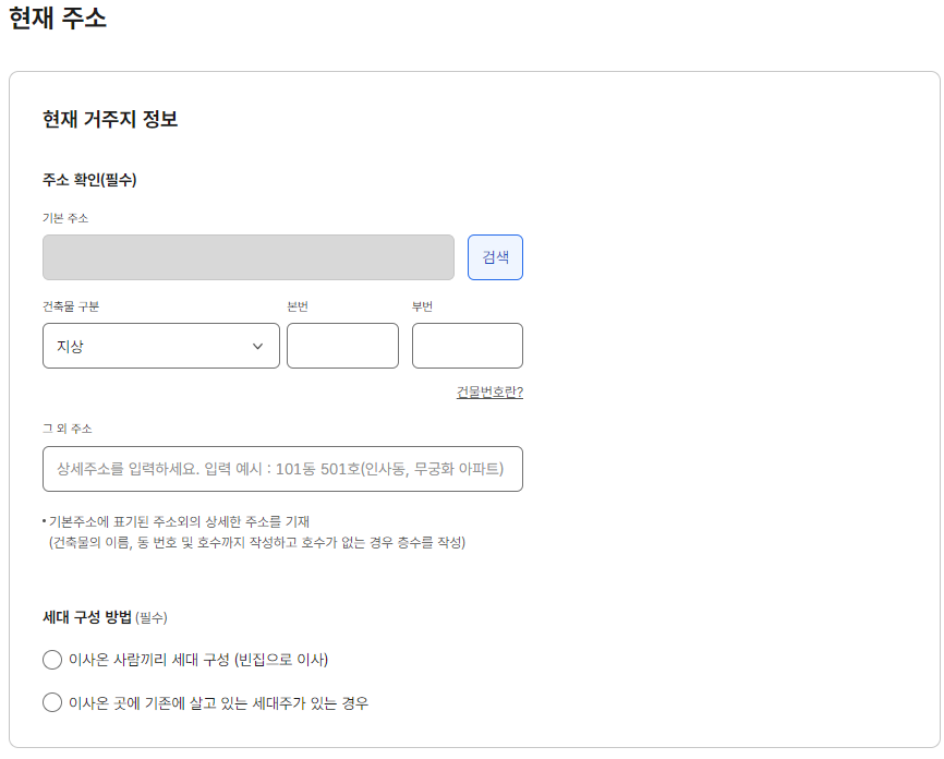 5. 현재 주소를 입력합니다. 전입 신고와 함께 신청할 수 있는 서비스도 있으니 살펴보시고 신청하시면 됩니다.
